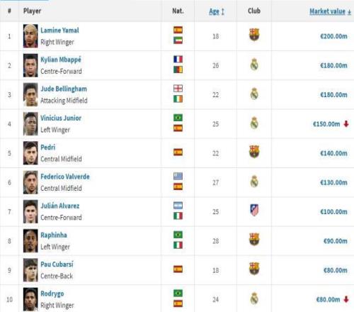 全球球员身价TOP10。这当中西甲占据6席,此外还有英超的哈兰德、萨卡和维尔茨,以及德甲的穆西亚拉。