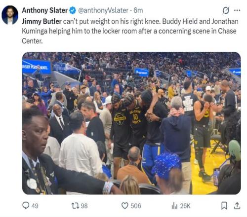 勇士记者安东尼-斯莱德发来最新消息,巴特勒的右膝无法负重,他进入更衣室是在希尔德、库明加的搀扶下。